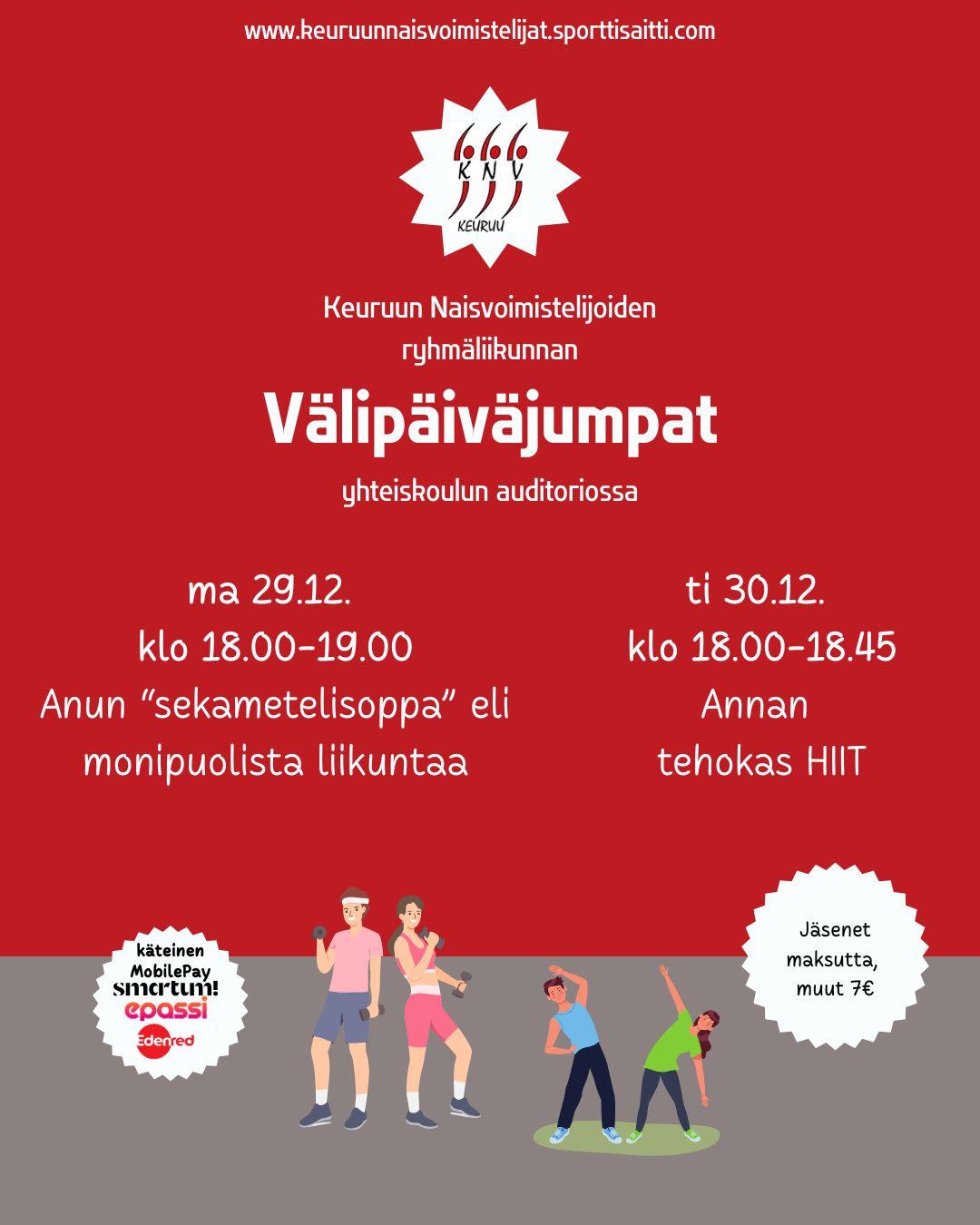Tervetuloa ryhmäliikunnan välipäiväjumppiin! Jäsenet jumppaavat maksutta, mutta jouluvieraat ja muut voivat tulla mukaan käteisellä, MobilePaylla tai liikuntaeduilla maksaen. Jumppalukkarin mukaan…